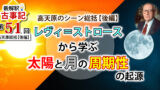 日食は月が太陽を隠してしまう現象ですが、古事記はその天体同士の重なりを「接近(距離が近い)」と捉えていました。そして、なんやかんやあって無事アマテラスが外に出てくると、太陽と月に適切な距離が生まれて、かつお互いが交互に出現する一日という単位が生まれました(詳細は古事記解説第51回をご視聴ください)。